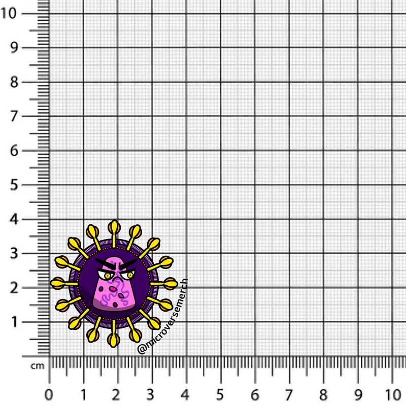 La taille désignée inclut le texte (nom, jeu de mot et @microversemerch) et représente la mesure la plus longue de l'image. Un espace blanc de quelques millimètres entoure l'image.
